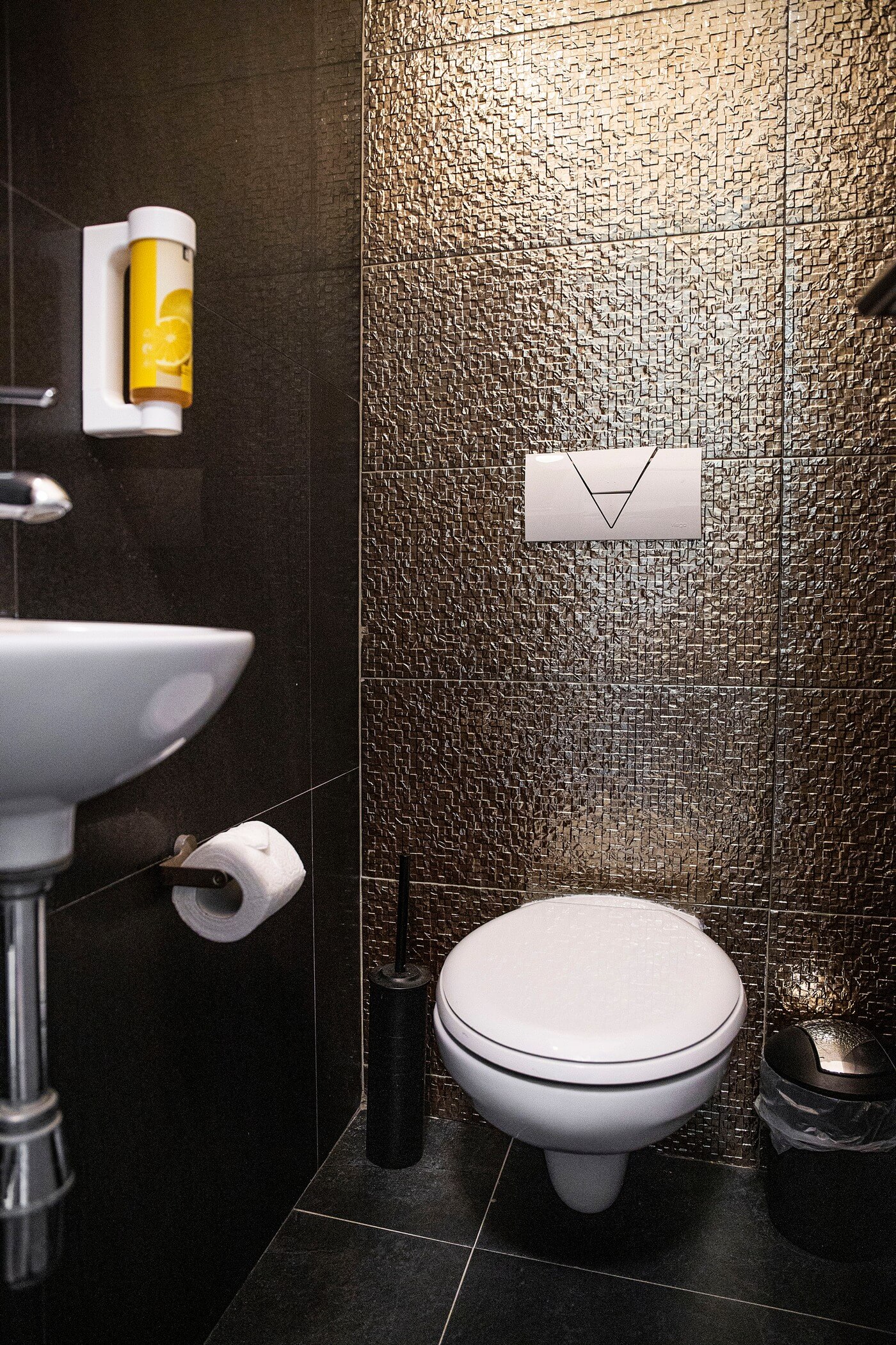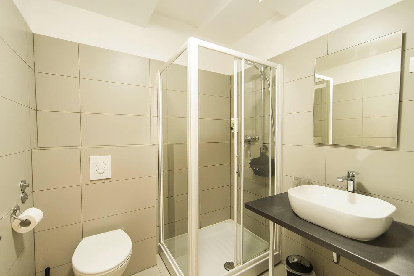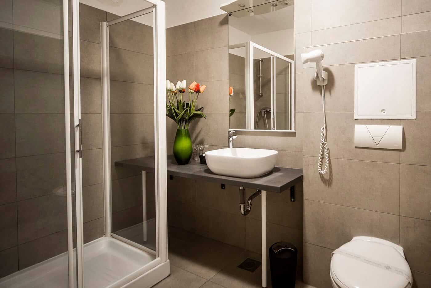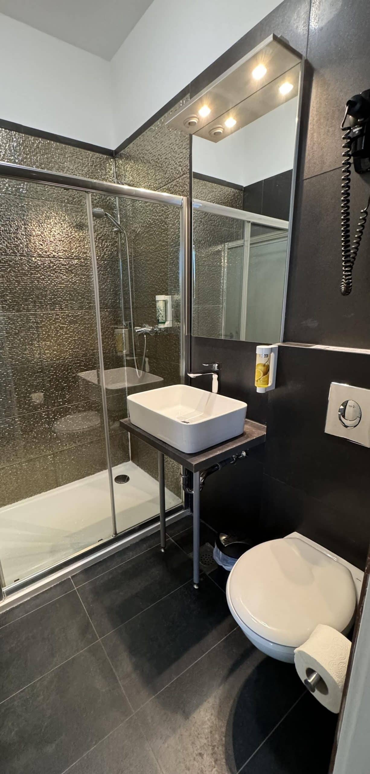 Each room features its own private bathroom with a toilet, sink, shower, toiletries (soap, hair & body wash, towels), and a hairdryer.